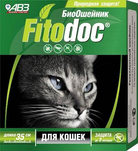 Био-ошейник АВЗ "Фитодок" предназначен для кошек. Ошейник представляет собой полимерную ленту для собак от светло-синего до темно-синего цвета, для кошек от светло-бирюзового до темно-бирюзового цвета со слабым специфическим запахом, с фиксатором. Ошейник репеллентный "Фитодок" выпускают длиной 80см (для крупных собак), 50см (для средних собак) и 35см (для мелких собак и кошек), в герметично закрытом бумажном пакете, упакованным в картонную пачку. Обладает выраженным репеллентным действием в отношении иксодовых и чесоточных клещей, а также блох, вшей и власоедов, паразитирующих у собак и кошек. Ошейник содержит: эфирные масла цитронеллы, лаванды, эвкалипта, маргозы, чайного дерева, вспомогательные компоненты.