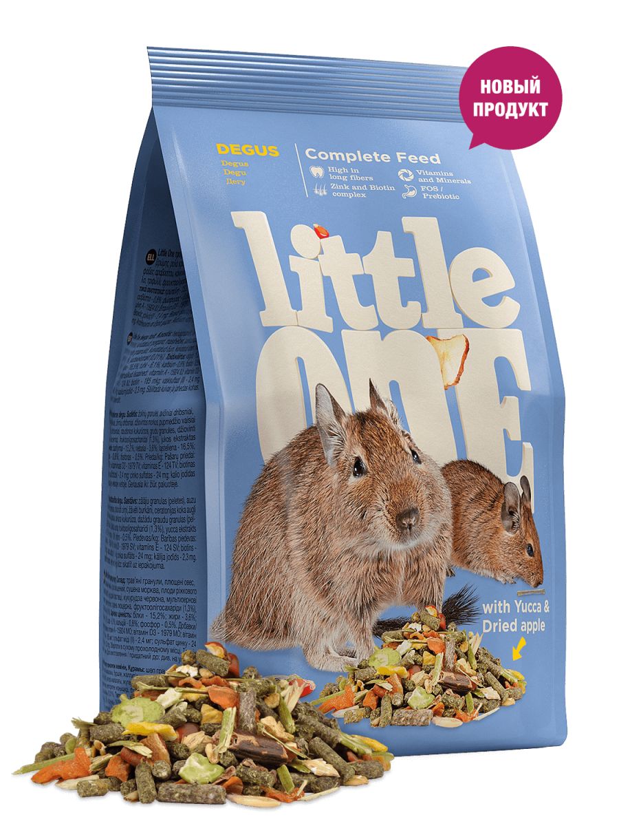 Рекомендация по кормлению:суточная доза корма Little One для дегу составляет 20-25 г на зверька. Следите, чтобы у дегу всегда была свежая вода. Помните, что у дегу всегда должно быть сено. Этот важный источник клетчатки является необходимым для пищеварения и правильного обмена веществ дегу.