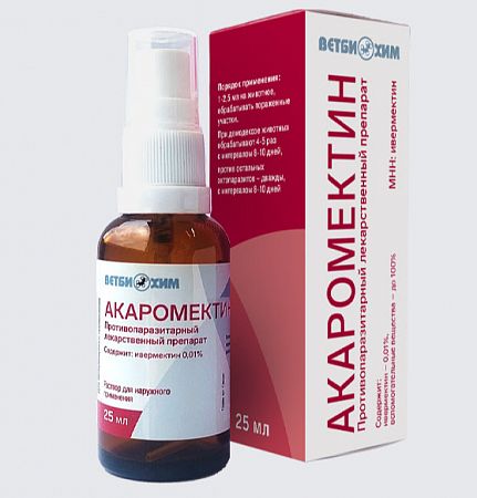 Акаромектин противопаразитарное лекарственное средство в форме раствора для наружного применения, в 1 мл которого содержится в качестве действующего вещества 0,1 мг ивермектина и вспомогательные вещества. Препарат представляет собой бесцветную прозрачную жидкость со слабым запахом. Выпускается препарат в полиэтиленовых флаконах с аэрозольным распылителем вместимостью 25 мл, обеспечивающих удобство применения, более экономное и эффективное использование препарата.