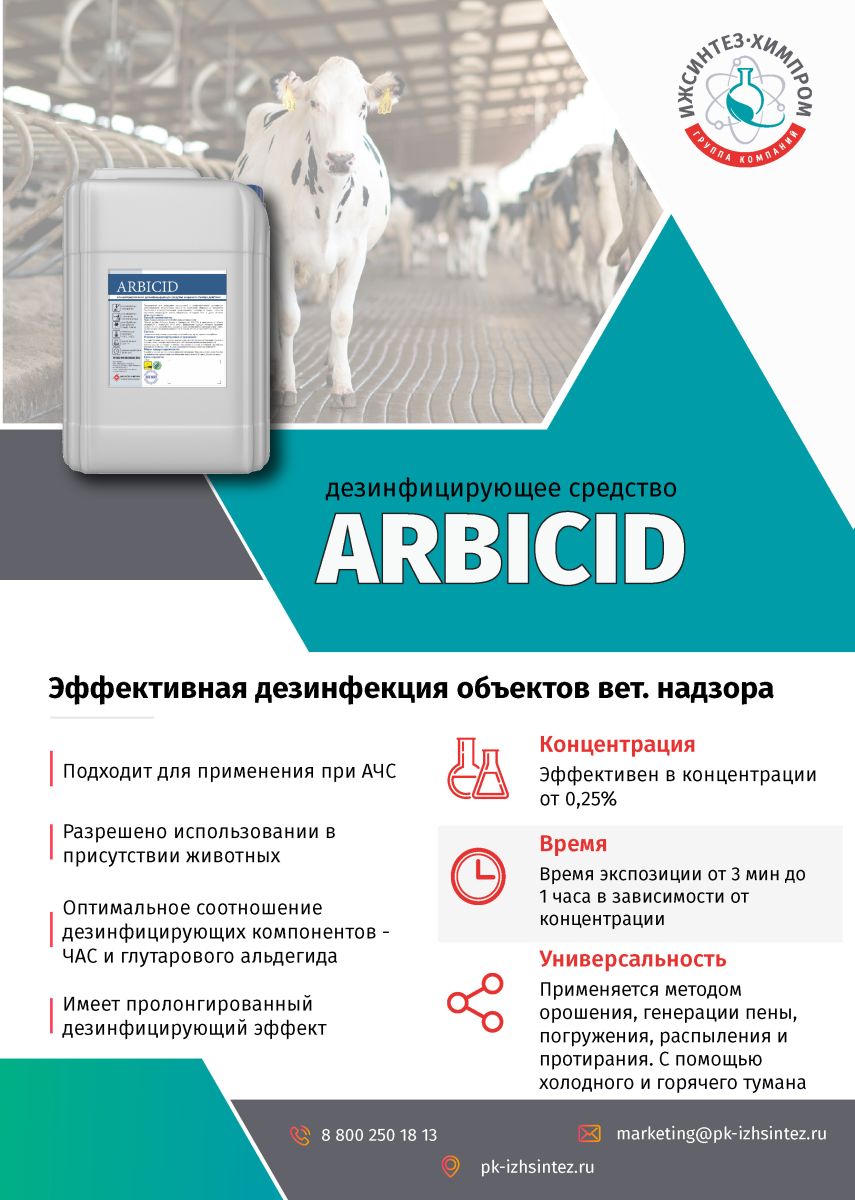 Назначение: АРБИЦИД - средство для дезинфекции объектов ветеринарного надзора и профилактики инфекционных болезней животных при температуре не ниже минус 18 градусов Цельсия. Для дезинфекции при более низких температурах используйте Arbicid Antifreeze. Область применения Дезинфекция изделий ветеринарного и медицинского назначения (включая инструменты), поверхностей в помещениях, жесткой мебели, поверхностей приборов и оборудования, санитарно-технического оборудования, уборочного инвентаря, посуды лабораторной, предметов ухода за больными животными при вирусных, бактериальных (включая туберкулез) инфекциях, кандидозах и дерматофитиях в лечебно-профилактических учреждениях (изоляторы, боксы), в животноводческих, птицеводческих и звероводческих помещениях, для находящегося в них технологического оборудования, вспомогательных объектов (включая инкубатории, яйцесклады), для молочных блоков и кормокухонь, для санитарно-технического оборудования и санитарных боен, открытых объектов (рампы, эстакады, платформы), для тары и одежды; Дезинфекция производственных помещений, технологического оборудования и территории, предприятий биологической, пищевой, перерабатывающей промышленности; Оработка поверхностей в инфекционных очагах и транспорте для перевозки животных и птицы (включая автомобильный, железнодорожный, водный и авиационный транспорт), а также для перевозки сырья и продукции животного происхождения; Проведение генеральных уборок в животноводческих помещениях; Дезинфекция помещений в ветеринарных клиниках или станциях, лабораториях, вивариях, цирках и зоопарках. Дезинфекция спецодежды и обуви обслуживающего персонала. Состав: содержит 24,8% четвертичных аммониевых соединений (дидецилдиметиламмоний хлорид - 7,8%, алкилдиметилбензиламмония хлорид -17,0%) и 10,7% глутарового альдегида в качестве действующих веществ, а также функциональные добавки. Характеристики Значение рН 1% водного раствора составляет 3,0-5,0. Средство АРБИЦИД представляет собой прозрачную жидкость коричневого цвета, имеющую слабый специфический запах. Легко смешивается с водой в любых соотношениях. Хранение Срок годности средства составляет 3 года при условии хранения в невскрытой упаковке в темном, сухом, вентилируемом помещении при температуре от минус 18°С до плюс 35°С. Не замораживать (температура замерзания минус 19°С). Срок хранения рабочих растворов - не более 14 суток. По истечении срока годности средство не должно применяться. Спектр антимикробной активности Средство для дезинфекции объектов ветеринарного надзора Арбицид является дезинфектантом высокого уровня, относится к 1 группе дезинфектантов с высокой вирулицидной активностью, обладает спороцидной и туберкулоцидной активностью. Средство эффективно против всех известных бактерий, грибов, вирусов всех трех классов устойчивости. Средство уничтожает все бактерии, грибы и вирусы I-IV групп патогенности. Перечень возбудителей болезней, в отношении которых средство Арбицид проявляет высокую антимикробную активность: актиномикоза - актиномикоза - аспергиллеза - африканской лихорадки - африканской чумы свиней - бешенства - бластомикоза - блютанг - болезни Ньюкасла - болезнь Ауески - ботулизма - бруцеллеза - ветряной оспы, опоясывающего герпетического лишая - геморрагических лихорадок - геморра