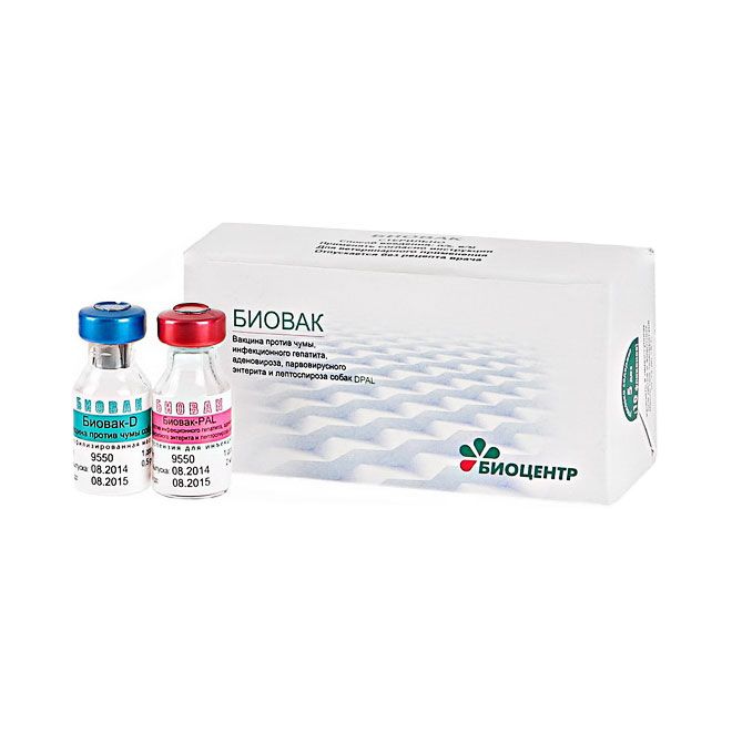 Вакцина содержит в своем составе: лиофилизированный живой компонент против чумы плотоядных БИОВАК-D и жидкий инактивированный компонент против парвовирусного энтерита, аденовирусных инфекций (инфекционного гепатита и аденовироза) и лептоспироза собак — БИОВАК-PAL. Сухой компонент представляет собой сухую аморфную массу бежевого цвета, иногда с бледно-розовым оттенком. Жидкий компонент вакцины представляет собой гомогенную суспензию, при отстаивании образующую рыхлый осадок, который при встряхивании легко разбивается в гомогенную взвесь. Цвет компонента — от розового до бежевого. Вакцину БИОВАК расфасовывают в ампулы. Сухой компонент против чумы собак БИОВАК-D расфасовывают в ампулы по 1 прививочной дозе. Жидкий компонент вакцины расфасовывают в ампулы по одной прививочной дозе. На каждой ампуле с жидким компонентом должна быть нанесена маркировка с указанием: краткого названия: БИОВАК-PAL (для вакцины против парвовирусного энтерита, аденовирусных инфекций и лептоспироза собак). Вакцину БИОВАК в ампулах упаковывают по одной или по пять прививочных доз в одной упаковке. На упаковке должно быть указано: наименование предприятия-изготовителя и его товарный знак; полное название препарата; номер серии и номер контроля; условия хранения; срок годности; обозначения ТУ. В каждую единицу упаковки должно быть вложено наставление по применению.