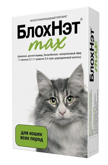 БлохНэт® max относится к группе комбинированных инсектоакарицидных лекарственных препаратов. Обладает выраженным инсектоакарицидным действием против всех фаз развития блох (Ctenocephalides felis, Ctenocephalides canis), иксодовых клещей (Ixodes spp., Dermacentor spp., Rhipicephalus spp.) половозрелых стадий развития вшей (Linognathus setosus) и власоедов (Trichodectes canis ), имаго и личинок саркоптоидных клещей, паразитирующих на собаках и кошках, а также репеллентным действием против кровососущих комаров.