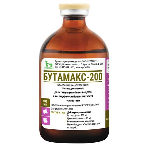 Бутамакс-200 в качестве действующих веществ содержит: бутафосфан – 200 мг/мл, цианокобаламин – 0,1 мг/мл, а в качестве вспомогательных веществ: метил-4-гидроксибензоат и воду для инъекций.