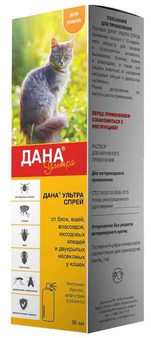 Дана Ультра спрей применяют собакам и кошкам с 10-недельного возраста для лечения и профилактики энтомозов, вызываемых блохами, вшами и власоедами, а также для защиты животных от нападения иксодовых клещей и двукрылых насекомых.