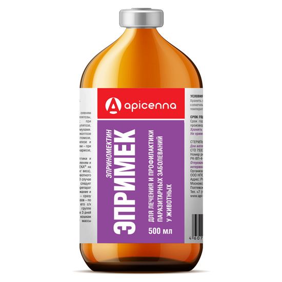 Эпримек вводят животным однократно с соблюдением правил асептики и антисептики: крупному и мелкому рогатому скоту, лошадям, оленям и верблюдам подкожно или внутримышечно из расчета 1 мл препарата на 50 кг массы тела (или 200 мкг действующего вещества на 1 кг массы тела), свиньям — внутримышечно по 1 мл Эпримека на 33 кг массы тела (или 300 мкг действующего вещества на 1 кг массы тела). В случае, если объем вводимого раствора составляет более 10 мл, то его вводят животному в несколько мест. Против нематод животных дегельминтизируют перед постановкой на стойловое содержание и весной перед выводом на пастбище, против личинок оводов обрабатывают сразу после окончания лета оводов, против возбудителей арахно-энтомозов — по показаниям. При применении препарата на сельскохозяйственных животных его предварительно испытывают на небольшой группе (7 – 10 голов) животных. При отсутствии осложнений в течение 3 дней после инъекции приступают к обработке всего поголовья. Собакам и кошкам Эпримек вводят из расчета 0,2 мл препарата на 10 кг массы тела животного (или 200 мкг действующего вещества на 1 кг массы тела). Препарат применяется однократно, но при необходимости можно ввести повторно, но не ранее, чем через 14 дней.