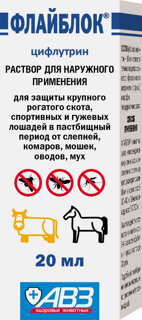 ФЛАЙБЛОК® применяют для защиты крупного рогатого скота, спортивных и гужевых лошадей в пастбищный период от нападения двукрылых насекомых - слепней, оводов, комаров, мошек и зоофильных мух.
