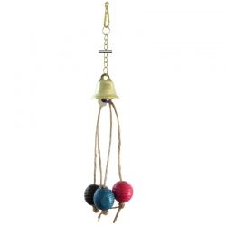 Подвешиваемая за карабин игрушка для птиц в виде колокольчика с деревянными украшениями на веревочках.