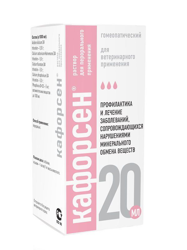 Кафорсен регулирует уровень кальция, фосфора и магния в организме животных, корректирует метаболизм костной ткани, нормализует остеогенез, а также способствует сокращению сроков консолидации костных отломков при травматических повреждениях костной ткани.