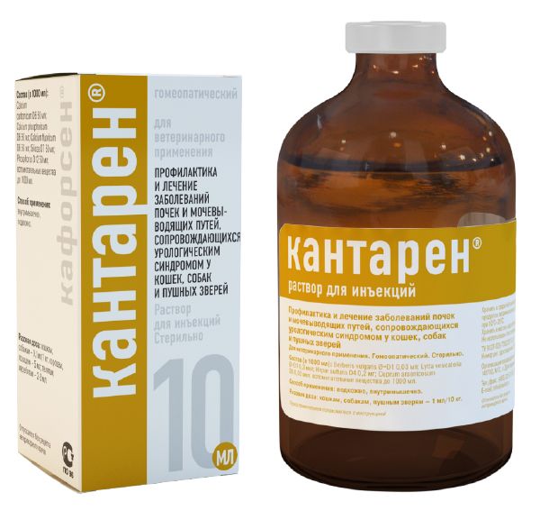 Кантарен обладает салуретическим, противовоспалительным, спазмолитическим и диуретическим действием. По степени воздействия на организм теплокровных животных препарат относится к малоопасным веществам, не обладает местнораздражающим и сенсибилизирующим действием. Компоненты, входящие в состав препарата в сверхмалых дозах, в организме животного не накапливаются.