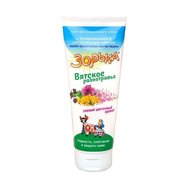 В состав крема «Зорька» Вятское разнотравье» с флорализином включен фитокомплекс из зверобоя, красного клевера, иван-чая и люцерны, придающий коже бархатистость и гладкость.