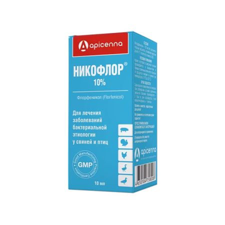 Никофлор® 10 % применяют для лечения свиней при заболеваниях органов дыхания бактериальной этиологии: при плевропневмонии, вызванной Actinobacillus pleuropneumoniae и /или Haemophilus parasuis, при атрофическом рините, вызванном Pasteurella multocida, Bordetella bronchiseptica, а также при других инфекционных заболеваниях свиней бактериальной этиологии и вторичных бактериальных инфекциях, вызванных микроорганизмами, чувствительными к флорфениколу.
