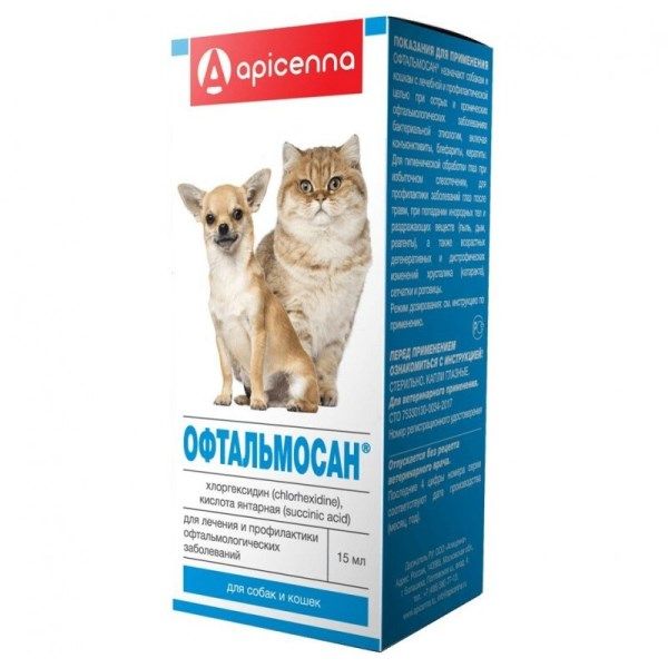 Офтальмосан — бактерицидные и противовоспалительные глазные капли для животных (Международное непатентованное наименование: хлоргексидина биглюконат + календулы цветков экстракт + ромашки цветков экстракт + очанки лекарственной экстракт + янтарная кислота) в 1 мл содержат: 0,15 мг хлоргексидина биглюконата, 1 мг янтарной кислоты, 4 мг экстракта цветков календулы лекарственной, 4 мг экстракта цветков ромашки аптечной, 4 мг экстракта очанки лекарственной, а также вспомогательные компоненты. По внешнему виду представляет собой жидкость от светло-коричневого до бурого цвета со специфическим запахом для наружного применения. Расфасовывают в полимерные флаконы-капельницы по 15 мл, которые упаковывают в картонные коробки.