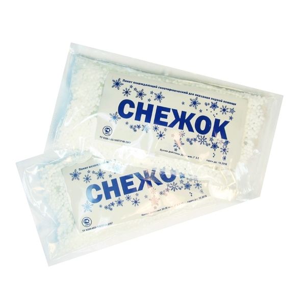 Гипотермический пакет «СНЕЖОК» предназначен как холодный компресс для оказания первой помощи.Пакеты «СНЕЖОК» предназначены для местного охлаждения тканей организма, способствуя тем самым снижению воспалительной реакции в тканях и остановки кровотечения. Используется при травмах, ушибах, перегревах, укусах насекомых, проч.