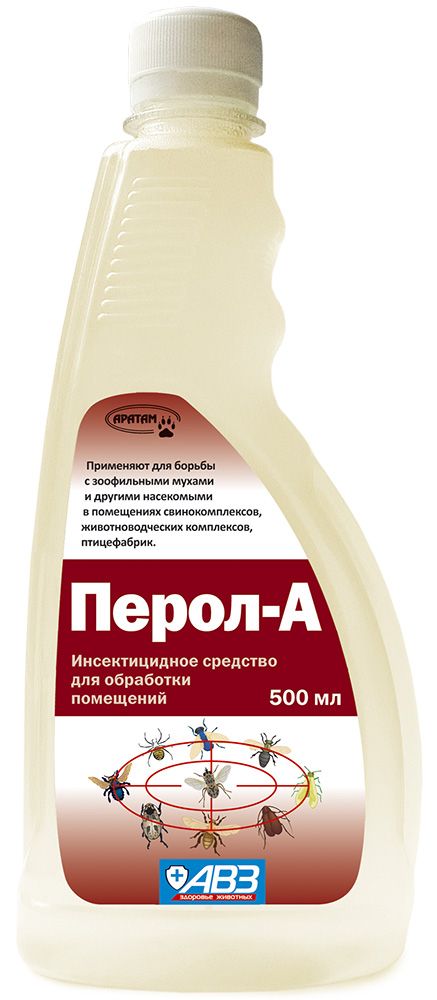 Перед работой с "Перол-А" с флакона снимают крышку и на ее место с помощью резьбового соединения закрепляют распылительную головку. На флакон слегка надавливают рукой до появления из форсунки струи средства, нажимая на рукоятку насоса, проводят обработку. Из одного полимерного флакона можно обработать 40–45 м2 площади помещения. Возможна обработка помещений с помощью ДУК, ранцевых опрыскивателей и т. п. После обработки помещение проветривают в течение 1 часа, кормушки и поилки тщательно моют, погибших мух сметают и уничтожают. Повторные обработки помещений проводят по показаниям в зависимости от численности мух, придерживаясь 12–14 дневного интервала.