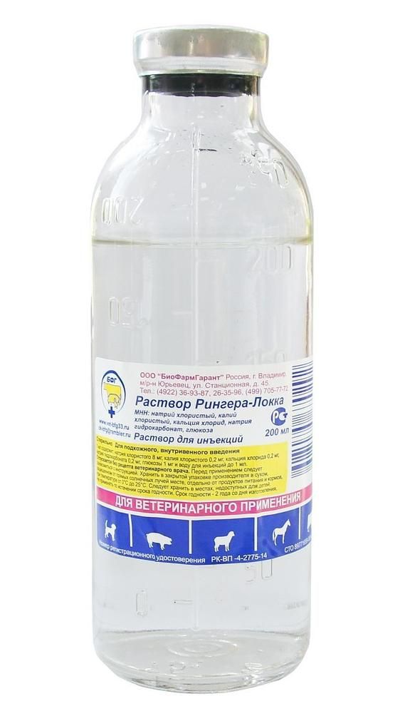 Раствор Рингера-Локка – комбинированный лекарственный препарат в форме раствора для инъекций, содержащий в качестве действующих веществ 0,8 г натрия хлорида, 0,02 г калия хлорида, 0,02 г кальция хлорида, 0,02 г натрия гидрокарбоната, 0,1 г глюкозы и в качестве растворителя воду для инъекций до 100 мл. Препарат представляет собой бесцветную прозрачную стерильную жидкость. Выпускают в форме раствора для инъекций расфасованным в стеклянные флаконы по 10, 20 и 100 мл. Флаконы укупорены резиновыми пробками и обкатаны алюминиевыми колпачками. Каждую единицу фасовки маркируют с указанием организации-производителя, названия лекарственного препарата, объёма в мл, номера серии, срока годности, условий хранения, способа применения, надписей «Для животных», «Стерильно» и сопровождают инструкцией по применению. ФАРМАКОЛОГИЧЕСКИЕ СВОЙСТВА Раствор Рингера-Локка изотоничен плазме крови животных, регулирует водно-солевое и кислотно-щелочное равновесие в организме животных. После введения препарата быстро всасывается из места инъекции и распределяется в органах и тканях животного. Препарат не оказывает раздражающего действия на ткани. ДОЗЫ И СПОСОБ ПРИМЕНЕНИЯ Раствор Рингера-Локка применяют подкожно или внутривенно в следующих дозах. При подкожном введении дозу препарата вводят дробно в разные места. Лошади, крупный рогатый скот 1000-3000 мл Мелкий рогатый скот 100-300 мл Телята до одного года 200-400 мл Ягнята, поросята 25-100 Дозы и сроки применения зависят от массы животного и течения болезни. ПОБОЧНЫЕ ДЕЙСТВИЯ В рекомендуемых дозах препарат обычно не вызывает у животных побочных действий и осложнений. Применение раствора в больших количествах может привести к развитию хлоридного ацидоза, гипергидратации. При таких осложнениях уменьшают дозу или препарат отменяют. Применение Раствора Рингера-Локка не исключает использование других лекарственных средств. ПРОТИВОПОКАЗАНИЯ Внутривенное введение раствора противопоказано при выраженном нарушении выделительной функции почек. ОСОБЫЕ УКАЗАНИЯ Продукты животноводства во время и после применения препарата используют без ограничений. При работе с Раствором Рингера-Локка следует соблюдать общие правила личной гигиены и техники безопасности, предусмотренные при работе с лекарственными средствами для животных. УСЛОВИЯ ХРАНЕНИЯ В закрытой упаковке производителя, в сухом, защищенном от прямых солнечных лучей, недоступном для детей и животных месте, отдельно от пищевых продуктов и кормов при температуре от 0 до 25 С. Срок годности препарата — 2 года со дня изготовления. Запрещается использовать лекарственное средство после окончания срока его годности.