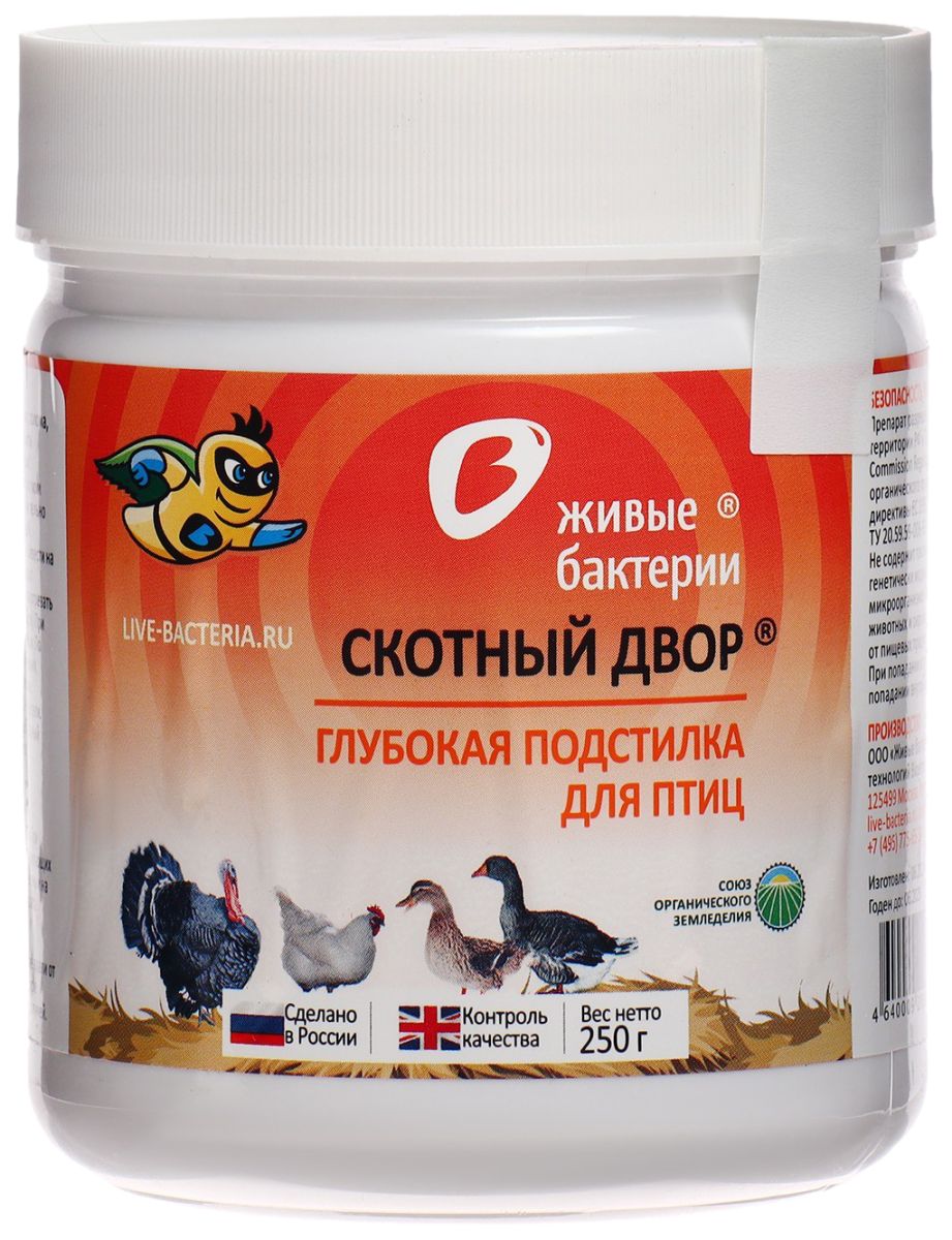 Препарат на основе бактерий для содержания кур и птицы на глубокой несменяемой, срок содержания до двух лет. Бактериальное средство для подстилки подавляет патогенную флору, грибки и образует полезную микрофлору для птицы. Уничтожает резкий неприятный запах. Зимой подстилка разогревается, что улучшает содержание птицы (при температуре не ниже -10°C). Безвредно для птицы, возможно поедание частичек препарата.