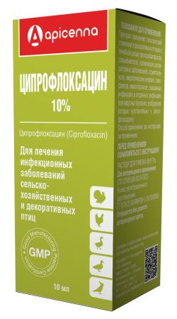 Противопоказанием к применению препарата является гиперчувствительность животного к компонентам лекарственного препарата. Запрещается применение лекарственного препарата курам-несушкам и ремонтному молодняку птиц менее чем за 2 недели до начала яйцекладки, ввиду накопления ципрофлоксацина в яйце. Ципрофлоксацин 10% не следует применять совместно с хлорамфениколом, теофиллином, тетрациклином,