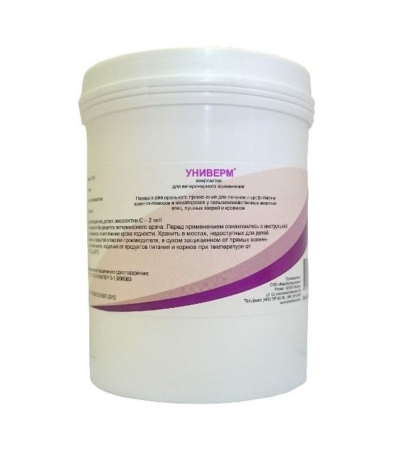 Действующее вещество препарата — аверсектин С, паразитоцид широкого спектра действия из группы авермектинов. Универм проявляет активность в отношении эндопаразитов — нематод, эктопаразитов — вшей, кровососок, блох, власоедов, саркоптоидных клещей, а также носоглоточных и желудочных оводов, паразитирующих у животных и птиц. Препарат изменяет активность хлорных каналов мембран клеток нервно-мышечной системы нематод и членистоногих, что приводит к блокаде электрической активности, к параличу и гибели паразита. Аверсектин С практически не проникает через гематоэнцефалический барьер, и не оказывает отрицательного воздействия на нервные ганглии млекопитающих. Препарат легко всасывается из желудочно-кишечного тракта и обладает высокой биодоступностью, максимальная концентрация его в крови отмечается через 5 ч. после перорального введения. Препарат по степени воздействия на организм теплокровных животных относится к малоопасным веществам и в рекомендуемых дозах не оказывает местнораздражающего, резорбтивно-токсического, мутагенного, сенсибилизирующего действия. Препарат токсичен для рыб и других гидробионтов.