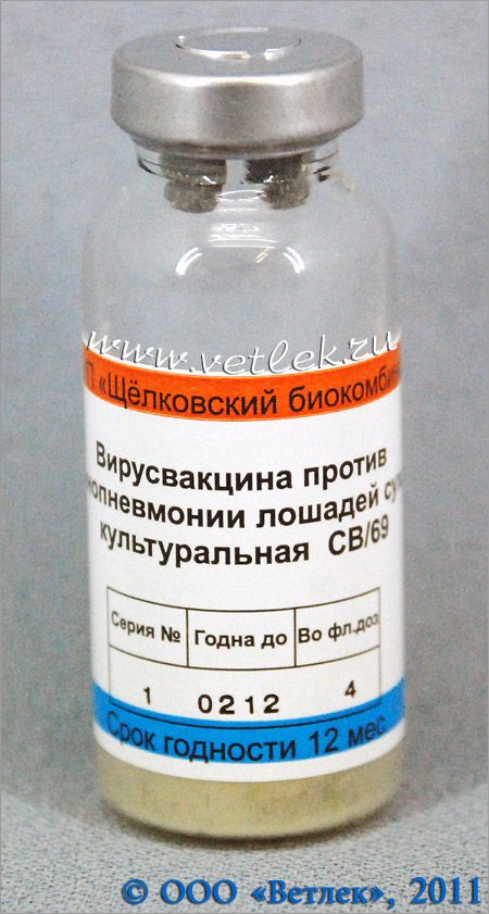 Вирусвакцина против ринопневмонии лошадей сухая культуральная — СВ/69 предназначена для иммунизации лошадей в неблагополучных по данному заболеванию хозяйствах. Вакцина изготовлена из авирулентного штамма СВ/69 вируса ринопневмонии лошадей, репродуцированного в культуре клеток почки поросенка и подвергнутого лиофильной сушке в специальной защитной среде, содержащей желатин пищевой и сахарозу. По внешнему виду представляет собой сухую пористую массу бледно-желтого или слегка розоватого цвета. При добавлении дистиллированной воды или раствора натрия хлорида изотонического 0,9 % должна полностью раствориться в течение 1 – 2 минут с образованием жидкости розового цвета без комочков, хлопьев и осадка. Вакцину по 2 дозы расфасовывают в стеклянных флаконах, герметично укупоренных полимерными крышками и обкатанных алюминиевыми колпачками.