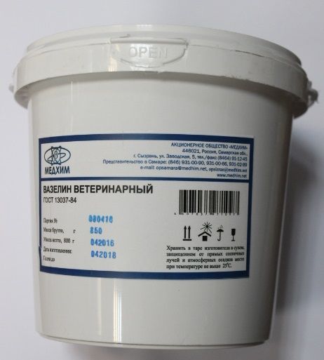 Вазелин ветеринарный – мазеобразное вещество, не имеющее запаха, и имеющее белый (либо жёлтый) цвет. Температура плавления составляет 37° – 50° С. Используется, если животным требуется лечение воспалительных процессов кожи, ожогов, дерматитов, эрозий, применяется при установке катетеров и клизм. Он отлично смягчает кожные покровы, при этом не проникая в ткани, оказывает защитное действие, образуя плёнку.