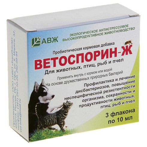Ветоспорин-Ж — пробиотическая кормовая добавка для животных. Обладает быстрым, мягким и пролонгированным действием против диспепсии телят, поросят и др. животных. Лечит диспепсию, подавляя патогены, и восстанавливает полезную флору, способствуя развитию сосочков рубца, улучшает аппетит. Обладает мощным антагонистическим действием в отношении патогенной микрофлоры. Стимулирует все звенья иммунитета, усиливает фагоцитоз.